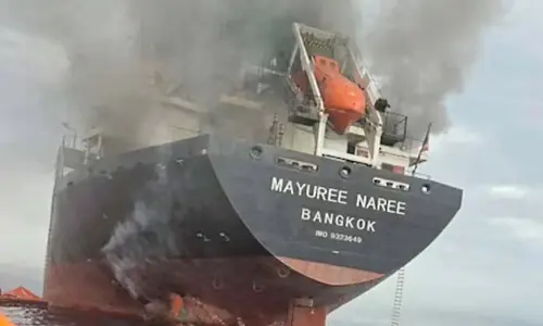 Two projectiles of unknown origin struck the Thai-flagged Mayuree Naree dry bulk vessel as it sailed through the strait earlier on Wednesday, causing a fire and damaging the engine room, the ship’s Thai-listed operator Precious Shipping said in a statement.